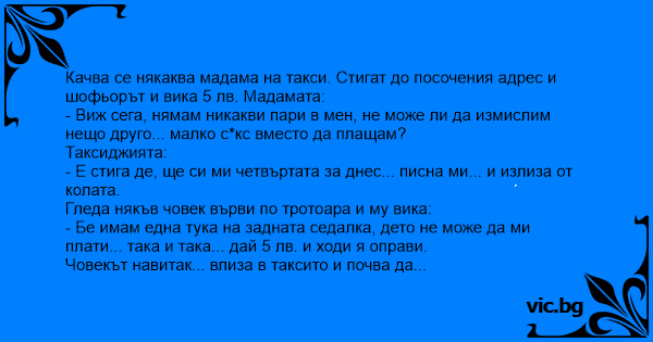 Качва се някаква мадама на такси. Стигат до посочения адрес и шофьорът и вика 5 лв. Мадамата: