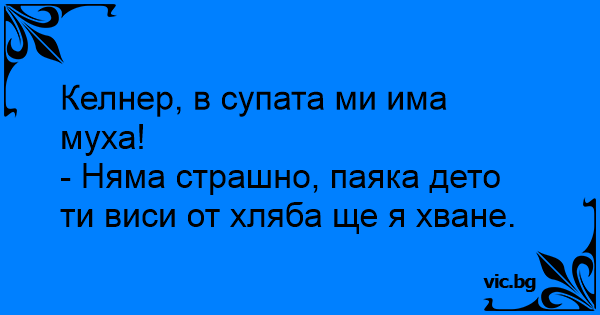 - Kelner, det er en flue i suppen min! - Ta det helt med rolig, det varer nok ikke så lenge! Ser De ikke edderkoppen på skjeen Deres?