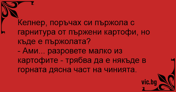 Келнер, поръчах си пържола с гарнитура от пържени картофи, но къде е пържолата?
