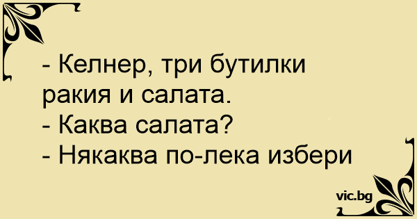 - Келнер, три бутилки ракия и салата.