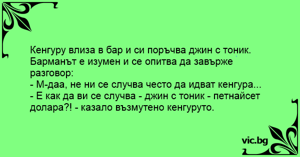 Кенгуру влиза в бар и си поръчва джин с тоник.