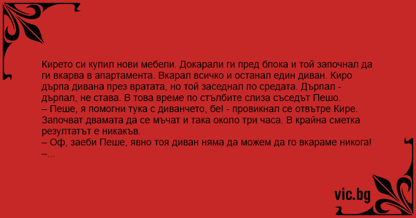 Кирето си купил нови мебели. Докарали ги пред блока и той започнал да ги вкарва в апартамента. Вкарал всичко и останал един диван. Киро дърпа дивана през вратата, но той заседнал по средата. Дърпал - дърпал, не става. В това време по стълбите слиза съседът Пешо. – Пеше, я помогни тука с диванчето, бе! - провикнал се отвътре Кире. Започват двамата да се мъчат и така около три часа. В крайна сметка резултатът е никакъв. – Оф, зaeби Пеше, явно тоя диван няма да можем да го вкараме никога! – Ама ти да го вкараш ли искаш, бе?