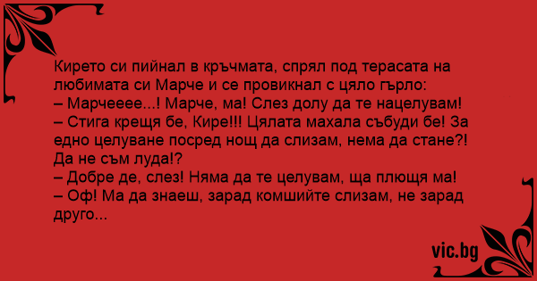 Кирето си пийнал в кръчмата, спрял под терасата на любимата си Марче и се провикнал с цяло гърло: