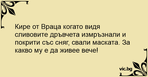 Кире от Враца когато видя сливовите дръвчета измръзнали и покрити със сняг, свали маската. За какво му е да живее вече!