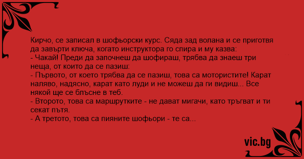 Кирчо, се записал в шофьорски курс. Сяда зад волана и се приготвя да завърти ключа, когато инструктора го спира и му казва: