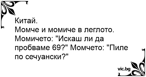 Момче и момиче в леглото. Момичето: "Искаш ли да пробваме 69?" Момчето: "Пиле по сечуански?"