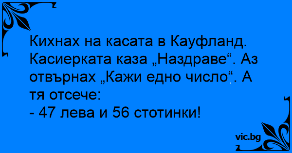 Кихнах на касата в Кауфланд. Касиерката каза „Наздраве“. Аз отвърнах „Кажи едно число“. А тя отсече: