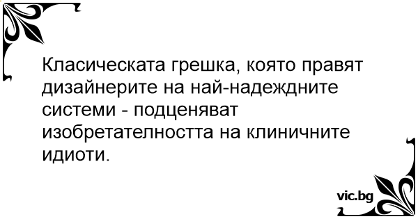 Класическата грешка, която правят дизайнерите на най-надеждните системи - подценяват изобретателността на клиничните идиоти.