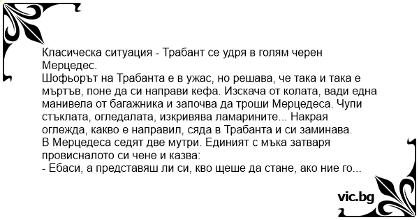 Класическа ситуация - Трабант се удря в голям черен Мерцедес.
