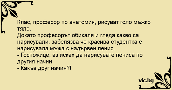 Докато професорът обикаля и гледа какво са нарисували, забелязва че красива студентка е нарисувала мъжа с надървен пенис.