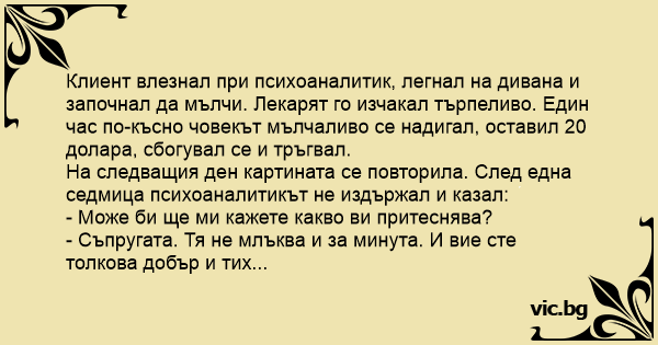 Клиент влезнал при психоаналитик, легнал на дивана и започнал да мълчи. Лекарят го изчакал търпеливо. Един час по-късно човекът мълчаливо се надигал, оставил 20 долара, сбогувал се и тръгвал.