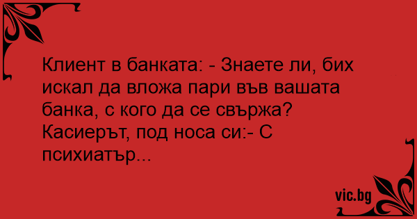 Клиент в банката: - Знаете ли, бих искал да вложа пари във вашата банка, с кого да се свържа?