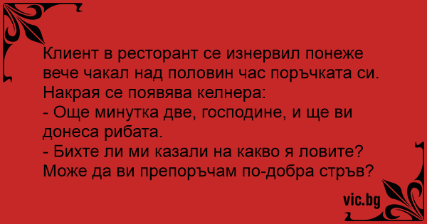 - Още минутка две, господине, и ще ви донеса рибата.