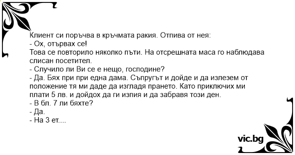 Клиент си поръчва в кръчмата ракия. Отпива от нея: