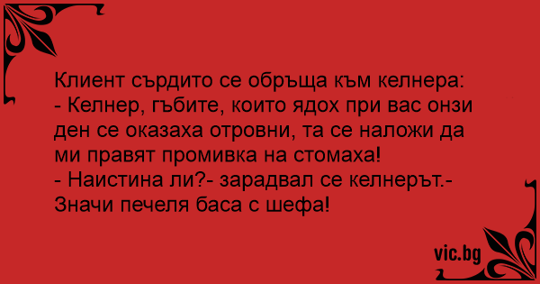 - Келнер, гъбите, които ядох при вас онзи ден се оказаха отровни, та се наложи да ми правят промивка на стомаха!