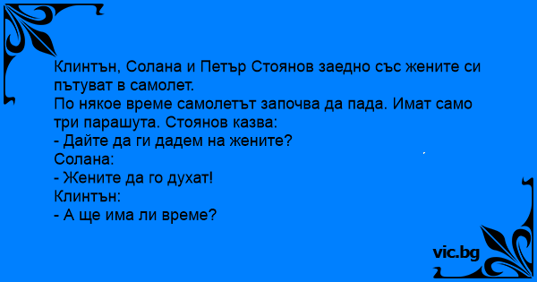 Во авион Елцин, Стоянов и Клинтън, заедно с техните съпруги, пътували за Белия дом със самолет. Самолетна катастрофа. На борда са англичанин, руснак, французин и стюардеса. Англичанинът казал: Michael Jackson var på en båt med en massa barn. När båten plötsligt började sjunka sa kaptenen: - Save yourself! - But what about the children? sade Michael. - Fuck the children!!! - Do we have that much time? Michael Jackson zit in een vliegtuig met allemaal kinderen. De piloot komt naar hem toe en roept: "Michael, the plane is gonna crash! I have 2 parachutes: one for you, one for me!" Vraagt Michael:... Лети Майкъл Джексън с частния си самолет и група дечица из небето. По едно време пилота го извикал и му казва: - Самолета се повреди, пък имаме само два парашута. Вземай единия и скачай. - Ами... Un avion en flamme perd de l'altitude. À son bord : le pilote, un homme, une brute, un prêtre et un scout. - On va se crasher ! Enfilez vos parachutes et sautez !! Et le pilote sauta. - Il ne reste... Etiopian yllä lenteli lentokone täynnä pakolaislapsia ja mukana oli myös piispa ja Michael Jackson. Yhtäkkiä pusikosta laukaistiin ohjus, ja koneesta hajosi siipi. Save the children, sanoi piispa....