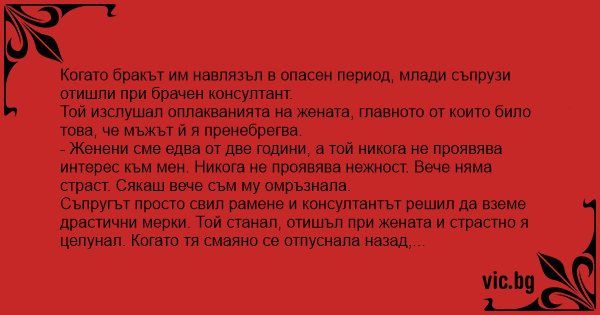 Когато бракът им навлязъл в опасен период, млади съпрузи отишли при брачен консултант.