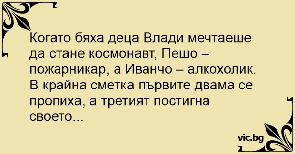 Когато бяха деца Влади мечтаеше да стане космонавт, Пешо – пожарникар, а Иванчо – алкохолик.