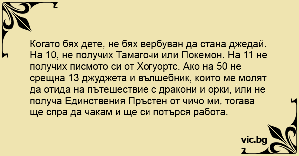На 10, не получих Тамагочи или Покемон. На 11 не получих писмото си от Хогуортс. Ако на 50 не срещна 13 джуджета и вълшебник, които ме молят да отида на пътешествие с дракони и орки, или не получа Единствения Пръстен от чичо ми, тогава ще спра да чакам и ще си потърся работа.