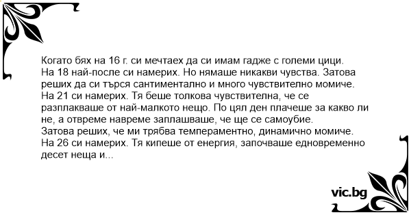 На 18 най-после си намерих. Но нямаше никакви чувства. Затова реших да си търся сантиментално и много чувствително момиче.