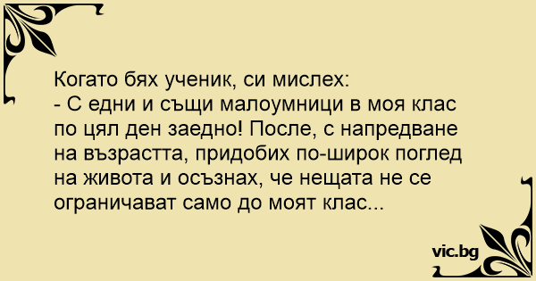 - С едни и същи малоумници в моя клас по цял ден заедно! После, с напредване на възрастта, придобих по-широк поглед на живота и осъзнах, че нещата не се ограничават само до моят клас...