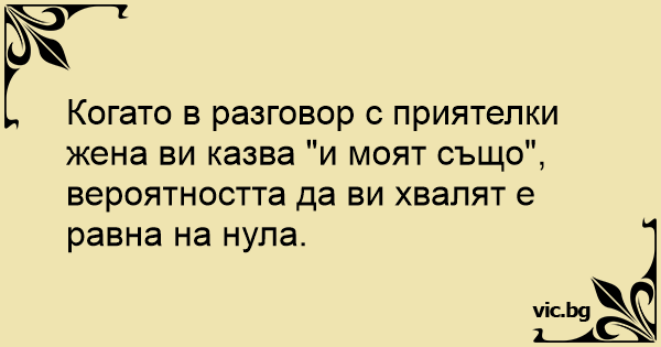 Когато в разговор с приятелки жена ви казва "и моят също", вероятността да ви хвалят е равна на нула.