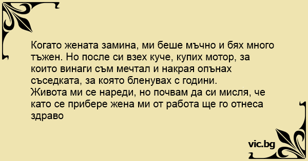 Когато жената замина, ми беше мъчно и бях много тъжен. Но после си взех куче, купих мотор, за които винаги съм мечтал и накрая опънах съседката, за която бленувах с години.