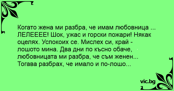 ЛЕЛЕЕЕЕ! Шок, ужас и горски пожари! Някак оцелях. Успокоих се. Мислех си, край - лошото мина. Два дни по късно обаче, любовницата ми разбра, че съм женен... Тогава разбрах, че имало и по-лошо...