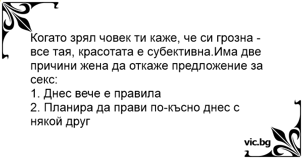 Когато зрял човек ти каже, че си грозна - все тая, красотата е субективна.Има две причини жена да откаже предложение за cekc: