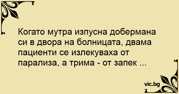 Когато мутра изпусна добермана си в двора на болницата, двама пациенти се излекуваха от парализа, а трима - от запек ...
