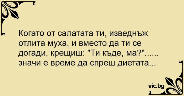 Когато от салатата ти, изведнъж отлита муха, и вместо да ти се догади, крещиш: "Ти къде, ма?"...... значи е време да спреш диетата...