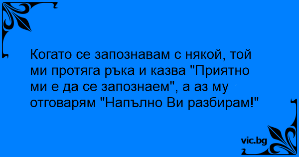 Когато се запознавам с някой, той ми протяга ръка и казва "Приятно ми е да се запознаем", а аз му отговарям "Напълно Ви разбирам!"
