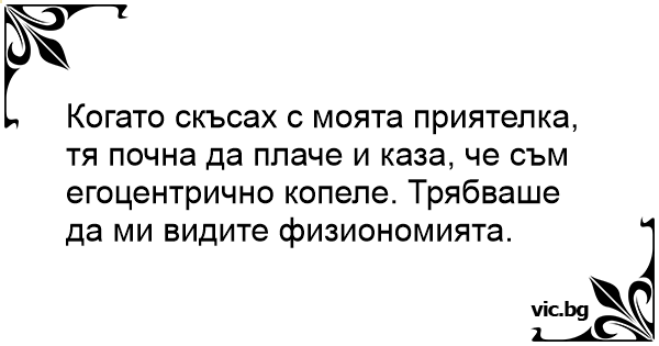 Когато скъсах с моята приятелка, тя почна да плаче и каза, че съм егоцентрично koпeлe. Трябваше да ми видите физиономията.