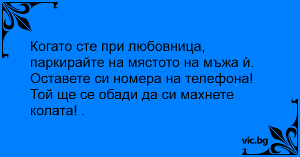 Когато сте при любовница, паркирайте на мястото на мъжа ѝ.