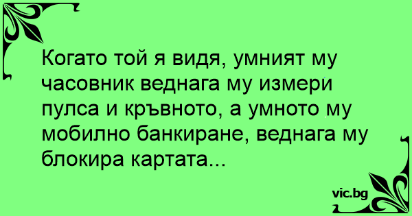 Когато той я видя, умният му часовник веднага му измери пулса и кръвното, а умното му мобилно банкиране, веднага му блокира картата...
