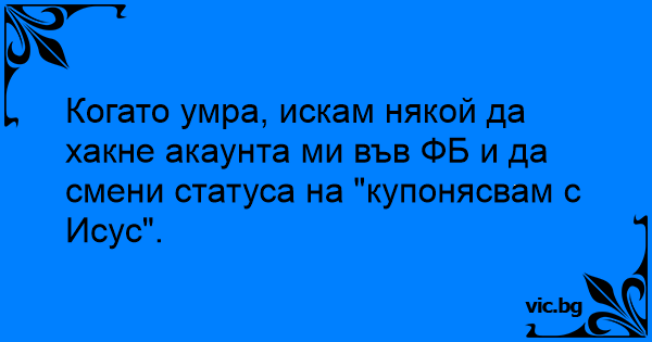 Когато умра, искам някой да хакне акаунта ми във ФБ и да смени статуса на "купонясвам с Исус".