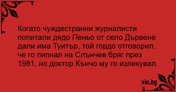 Когато чуждестранни журналисти попитали дядо Пеньо от село Дървене дали има Туитър, той гордо отговорил, че го пипнал на Слънчев бряг през 1981, но доктор Кънчо му го излекувал.