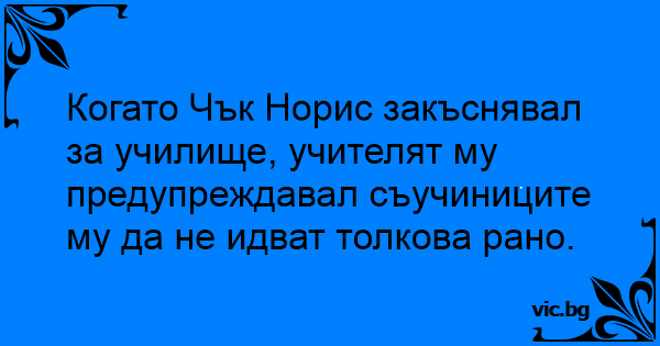 Когато Чък Норис закъснявал за училище, учителят му предупреждавал съучиниците му да не идват толкова рано.