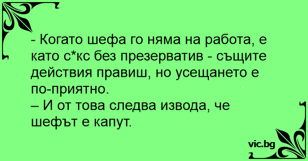 - Когато шефа го няма на работа, е като cekc без пpeзepbatиb - същите действия правиш, но усещането е по-приятно.