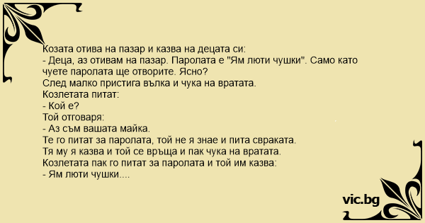 - Деца, аз отивам на пазар. Паролата е "Ям люти чушки". Само като чуете паролата ще отворите. Ясно?