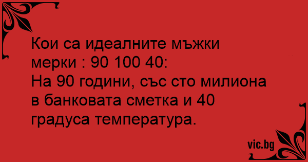 Jakie są idealne wymiary mężczyzny? - 90/60/42. 90 lat, 60 milionów na koncie i 42 stopnie gorączki.