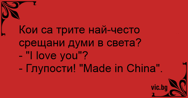 — Які три слова найчастіше зустрічаються по всьому світу? — Я тебе люблю? — Ці слова звучать так: — Маdе іn Сhіnа...
