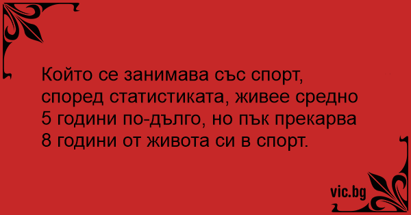 Който се занимава със спорт, според статистиката, живее средно 5 години по-дълго, но пък прекарва 8 години от живота си в спорт.