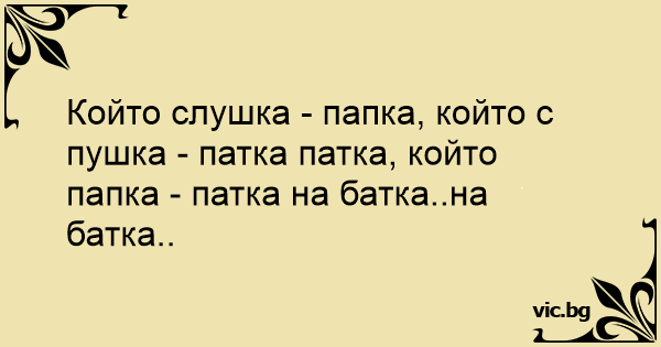 Който слушка - папка, който с пушка - патка патка, който папка - патка на батка..на батка..