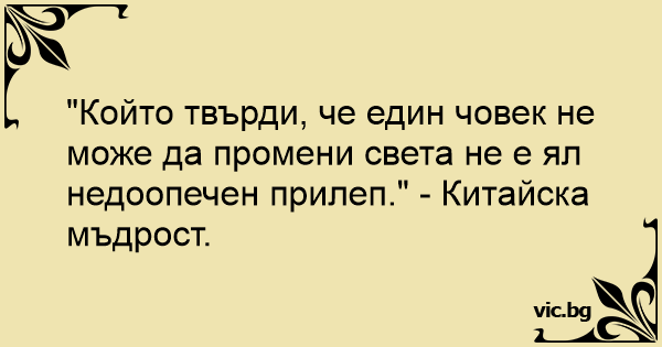 "Който твърди, че един човек не може да промени света не е ял недоопечен прилеп." - Китайска мъдрост.