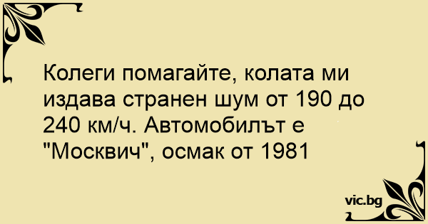 Колеги помагайте, колата ми издава странен шум от 190 до 240 км/ч. Автомобилът е "Москвич", осмак от 1981