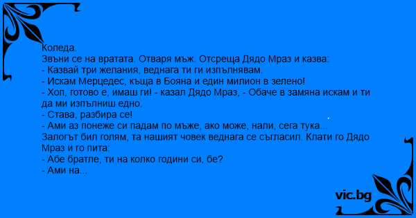 Залогът бил голям, та нашият човек веднага се съгласил. Клати го Дядо Мраз и го пита: