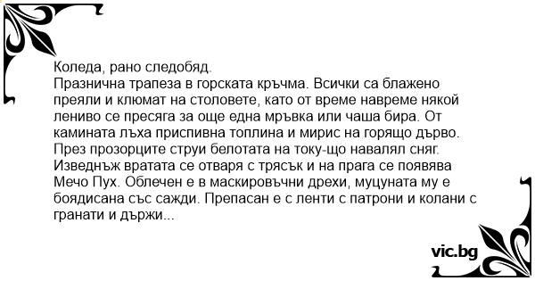 Празнична трапеза в горската кръчма. Всички са блажено преяли и клюмат на столовете, като от време навреме някой лениво се пресяга за още една мръвка или чаша бира. От камината лъха приспивна топлина и мирис на горящо дърво. През прозорците струи белотата на току-що навалял сняг.