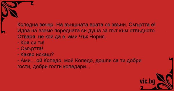 Коледна вечер. На външната врата се звъни. Смъртта е! Идва на вземе поредната си душа за път към отвъдното.