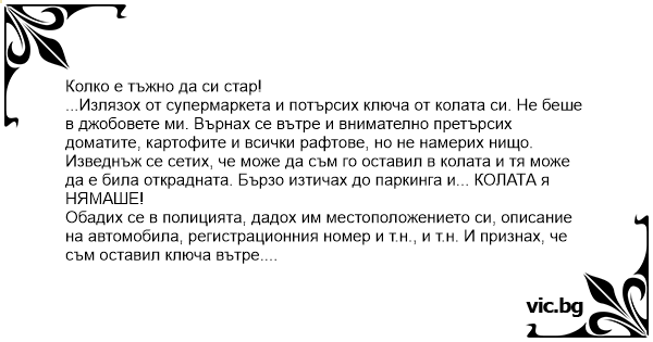 Изведнъж се сетих, че може да съм го оставил в колата и тя може да е била открадната. Бързо изтичах до паркинга и... КОЛАТА я НЯМАШЕ!